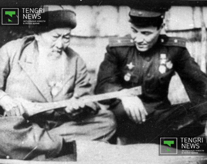 Сын казахского акына Жамбыла Жабаева погиб при освобождении города в Днепропетровской области. На фото: Герой Советского Союза Малик Габдуллин у акына в селе Узунагач Алма-Атинской области, 1943 год. Фото: Центральный государственный архив кинофотодокументов и звукозаписей РК.