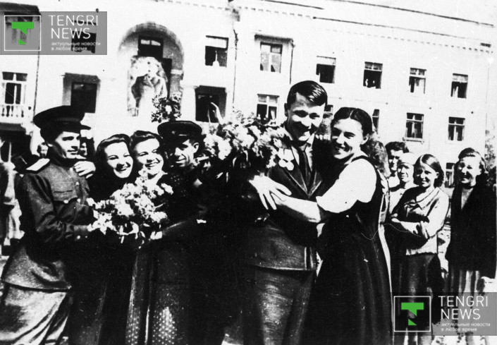 Народные ликования в День Победы над фашистской Германией. Алма-Ата, 9 мая 1945 года. Фото: Центральный государственный архив кинофотодокументов и звукозаписей РК.