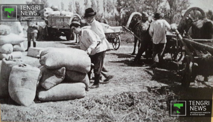 Сдача хлеба для фронта, Алма-Атинская область, 1941 год. Фото: Центральный государственный архив кинофотодокументов и звукозаписей РК.