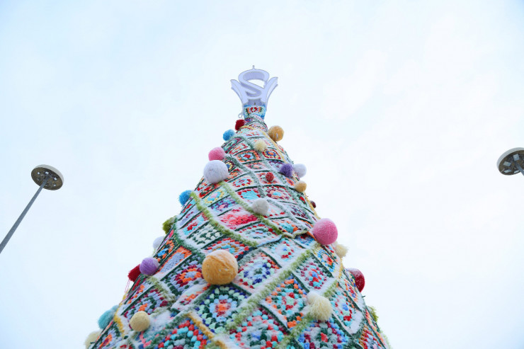 Вязаные квадраты из Нур-Султана и его пригорода, Алматы, Петропавловска, Актобе, Тараза, Караганды собрали в гигантское лоскутное одеяло и надели на металлическую конструкцию в форме елки. Нынешний арт-объект получился вдвое выше прошлогоднего. На новогоднюю инсталляцию потребовалось более 70 килограммов пряжи.