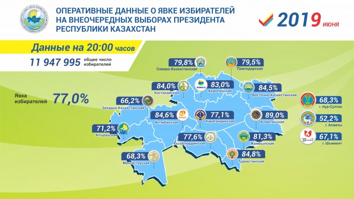 По данным ЦИК на 20.00, явка на выборы составила 77 процентов. В большинстве регионов Казахстана голосование завершено. Избирательные участки продолжают работать на западе страны.