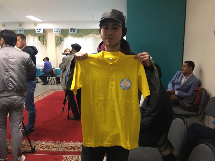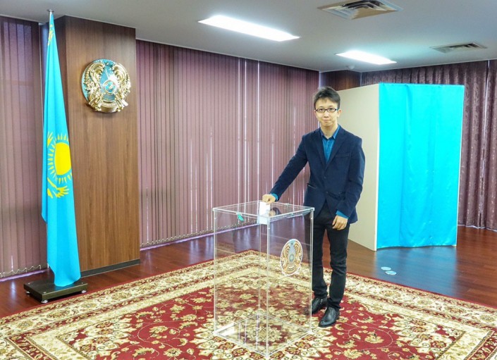 Это Абай. Ему 19 и это его первые выборы. В честь такого события парню вручили небольшой подарок.