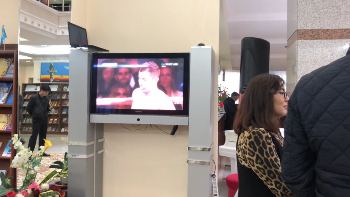 А вот так транслировали бой Головкина на избирательных участках в столице. Показывать долго не пришлось - GGG отправил Роллса в нокаут в четвертом раунде.