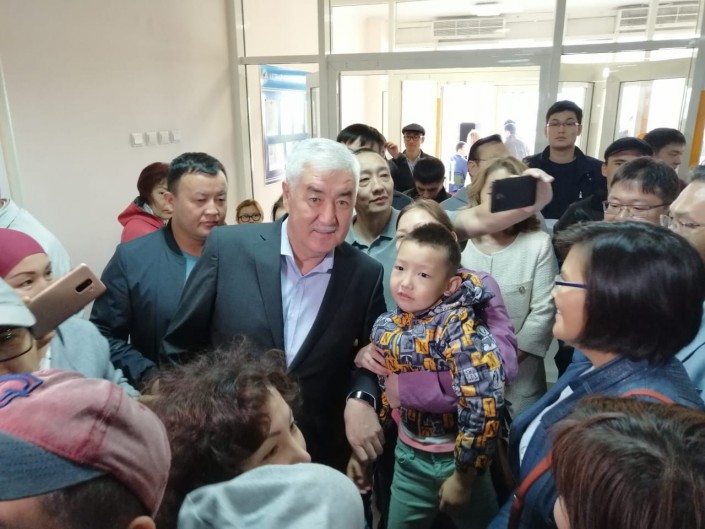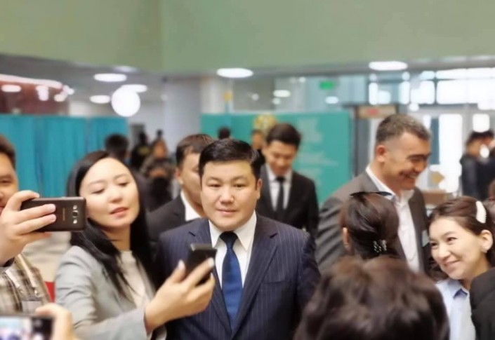 Позже других кандидатов на избирательный участок пришел Амиржан Косанов. На его участке много людей, и пока он стоит в очереди - делает селфи с избирателями.