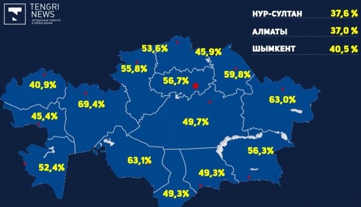 Самая низкая явка, по данным ЦИК на 16.00, в Алматы - 45,7 процента. Самая высокая - в Актюбинской области 79,7 процента. Подробнее тут.