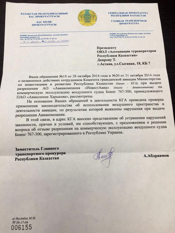 "Обращение о незаконных действиях сотрудников Комитета гражданской авиации при выдаче разрешения авиакомпании "Инвест Авиа" на коммерческую эксплуатацию воздушного судна Boeing-767-300, принадлежащего авиалиниям Харькова, рассмотрено. В деятельности КГА проведена проверка применения законодательства об использовании воздушного пространства, по результатам которой выявлены нарушения при выдаче разрешения авиакомпании. В адрес КГА внесено предписание об устранении нарушений законности, также с предложением о решении вопроса об отзыве разрешения на эксплуатацию самолета Boeing 767-300, зарегистрированного на Украине", - говорится в сообщении Главной транспортной прокуратуры Казахстана.