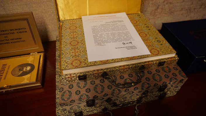 Сувенирный экземпляр этой книги с отчеканенной обложкой - подарок Нурсултану Назарбаеву от президента Грузии Эдуарда Шеварднадзе, сделанный в 1997 году. Среди редких изданий также "Всемирная история" Фридриха Шлоссера, ранее хранившаяся в библиотеке российского императора Александра II.