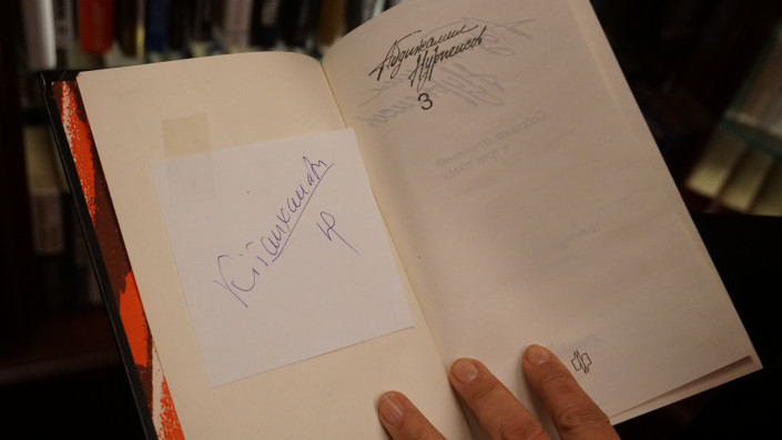 Среди них труды с личными автографами космонавта Алексея Леонова, писателей, поэтов и артистов - Чингиза Айтматова, Расула Гамзатова, Иосифа Кобзона, Галины Вишневской.