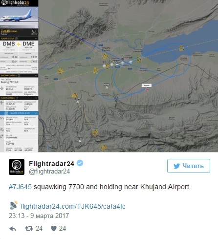 Некоторое время самолет наматывал круги в небе вокруг худжандского аэропорта. "Кружит в воздухе, сбрасывая топливо примерно на час. Очень странно", - сообщали СМИ. По данным онлайн-табло московского аэропорта Домодедово, рейс TJK645 должен был прибыть в российскую столицу в 21.25 по местному времени 9 марта.