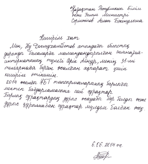 Выпускница школы-гимназии из Петропавловска Айнур Серик извинилась перед министром образования и науки Асланом Саринжиповым, передает корреспондент Tengrinews.kz. Она направила письмо на имя Саринжипова.