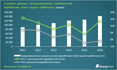 По итогам I полугодия 2017 среднемесячная номинальная заработная плата составляла 144,95 тысяч тенге - на 5,1 процента больше, чем в аналогичном периоде годом ранее.