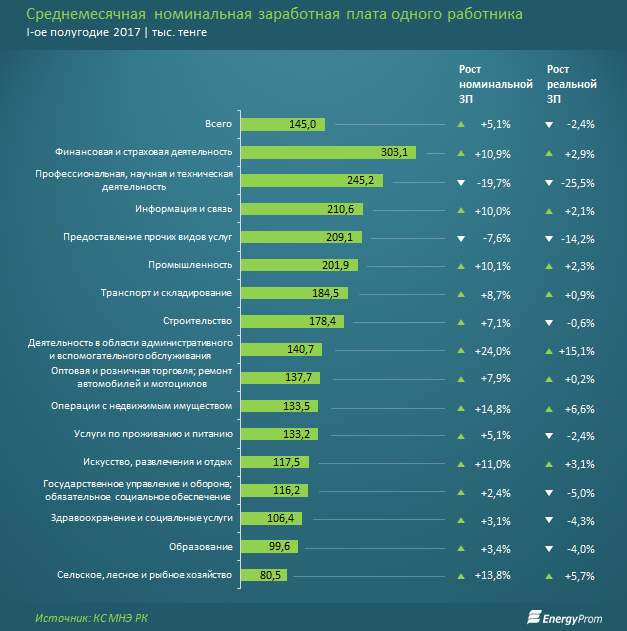 Примечательно, что, несмотря на курс страны на модернизацию и цифровизацию, сильнее всего ощутили снижение покупательской способности зарплат сотрудники профессиональной научной и технической сфер деятельности (-25,5 процента год-к-году). Номинальная заработная плата в научно-технических отраслях сократилась до 245,17 тысяч тенге по итогам I полугодия, это на 19,7 процента меньше, чем в аналогичном периоде 2016 года.