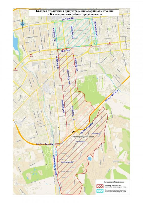 Это коснется жилых домов и иных зданий, расположенных на территории Бостандыкского района в контуре проспекта Аль-Фараби и Абая и улиц Гагарина и Ауэзова. А также западная граница Ботанического сада. Воды не будет и в микрорайонах Баганашыл, Казахфильм и Нур Алатау.