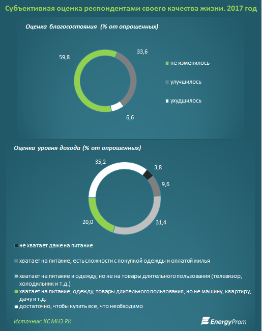 Любопытно и то, что реальный спад доходов, фиксируемый статданными (-0,3 процента за год по итогам первого квартала 2017 и -2,1 процента по итогам второго квартала), на субъективной оценке казахстанцами своего благосостояния не сказался. Более того, лишь 6,6 процента считают, что их благосостояние ухудшилось, 59,8 процента уверены, что не изменилось, и сразу 33,6 процента видят улучшения.