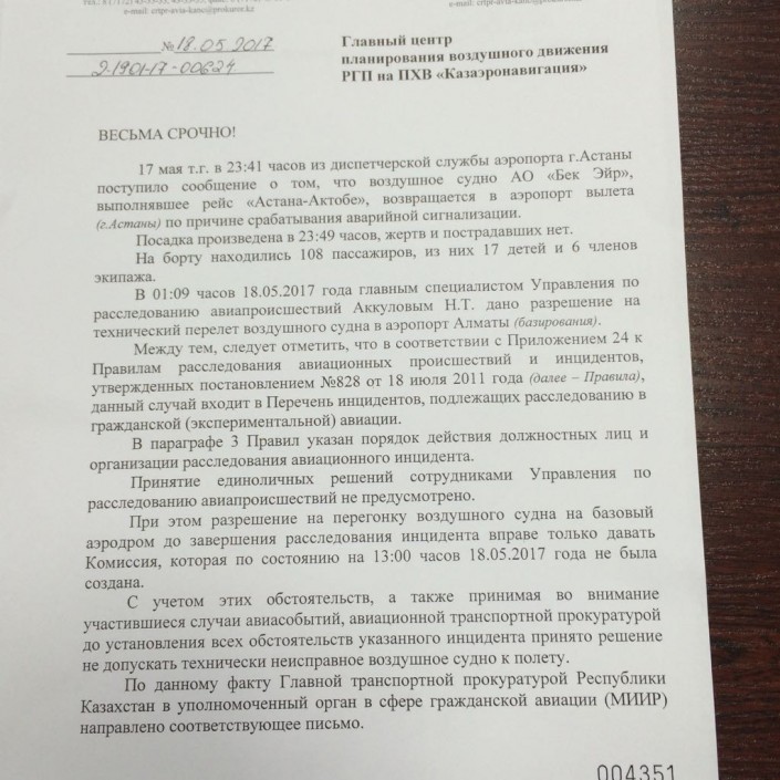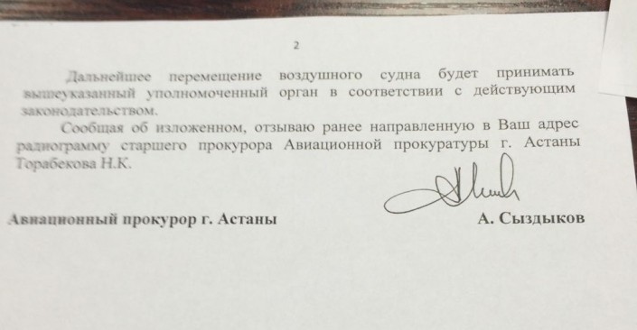 Жумасултанов также сообщил, что получили письмо от авиационного прокурора Астаны, где поясняются причины задержания.