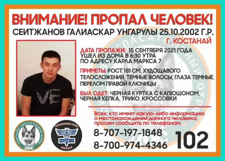 18-летний Галиаскар Сеитжанов, пропавший в Костанае полтора месяца назад, найден мертвым. В воскресенье, 7 ноября, информацию об обнаружении тела распространили волонтеры поисково-спасательного отряда "Дос", сообщает Tengrinews.kz со ссылкой на портал "Алау".