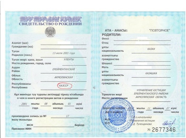 Скан документа в Facebook выложил пользователь Улан Хоршатулы. Согласно данным из свидетельства, девочка родилась в Ерейментауском районе в селе Уленты 13 июля 2001 года. На документе стоит печать и подпись и.о. начальника управления юстиции Д. Тулендиновой.