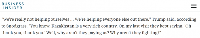 "Мы действительно не помогаем себе... Мы помогаем всем остальным. Вы знаете, Казахстан - очень богатая страна. Во время моего последнего визита они все время говорили:" О, спасибо, спасибо ". Но почему они не платят нам? Почему они не борются?" - приводит издание слова американского лидера в книге.
