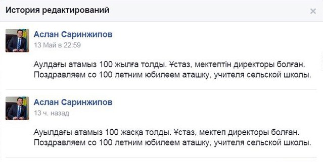 Саринжипов оперативно отреагировал на критику пользователей. "Люди, разместившие пост в Фейсбуке от моего имени, допустили ошибки. Приносим извинения. Ошибки исправили, за грамотность людей, читающих Фейсбук, порадовались. Следите за новостями. Спасибо!" - написал он субботу в своем аккаунте.