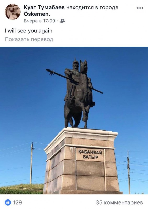 Отметим, сам экс-аким Куат Тумабаев, похоже, уже попрощался с Усть-Каменогорском. На его странице в соцсети появилась надпись, говорящая о том, что он покидает город. Экс-аким опубликовал в Instagram фотографию памятника Кабанбай батыру, который расположен на выезде из Усть-Каменогорска, и подписал ее "I will see you again" - "Я тебя еще увижу".