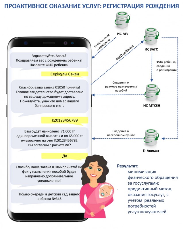 Отмечается, что для этих целей роженица должна зарегистрироваться в базе мобильных граждан: зайти в "Личный кабинет", в графе "телефон" указать номер мобильного телефона. Ранее глава госкорпорации "Правительство для граждан" Аблайхан Оспанов рассказал, что при рождении ребенка информация поступает в информационную систему Министерства здравоохранения. Ведомство должно поздравить и запросить, какие фамилию, имя и отчество родители хотят дать ребенку. Данная информация сразу поступит в загс, инициируется присвоение ИИН, и эта информация должна сразу же перейти в Министерство труда и соцзащиты населения для того, чтобы начислить необходимые виды пособия на его лицевой счет. Он отметил, что после подтверждения согласия на получение пособий информация будет поступать в Е-Акиматы для автоматического присвоения очереди в детские сады.