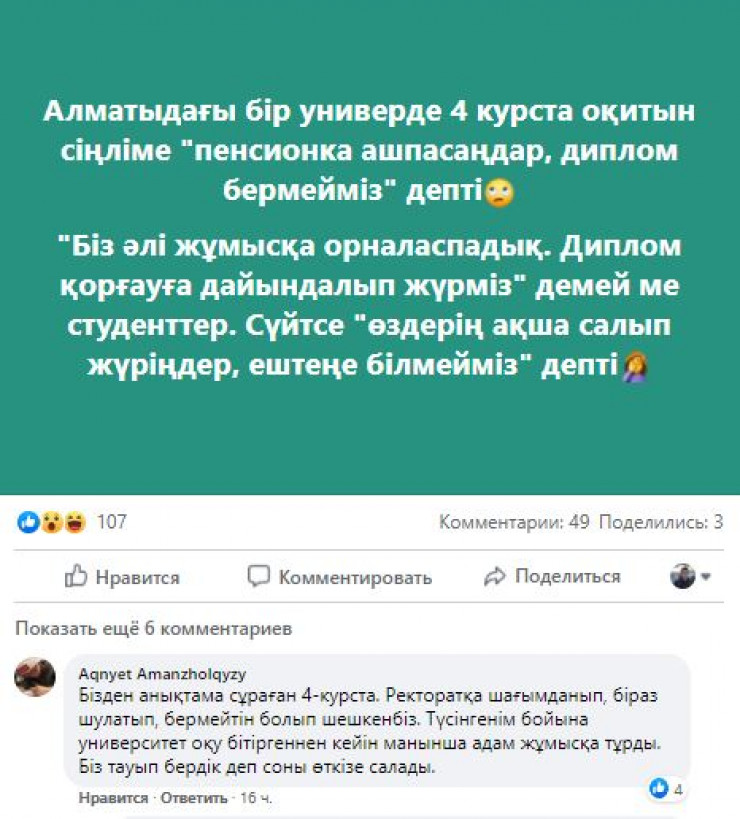 Facebook желісінің қолданушысы Алматыдағы университеттердің бірінде студенттерге "зейнетақы жинағын ашып, өздерің ақша салып отырыңдар" деп міндеттегенін жазды.