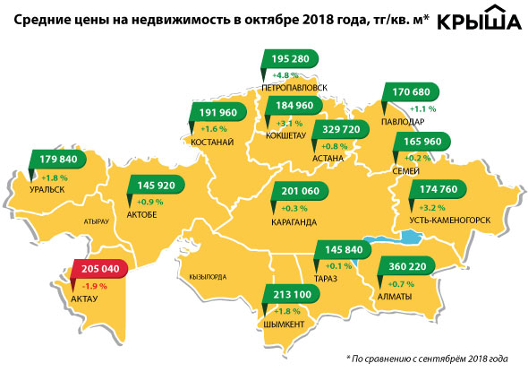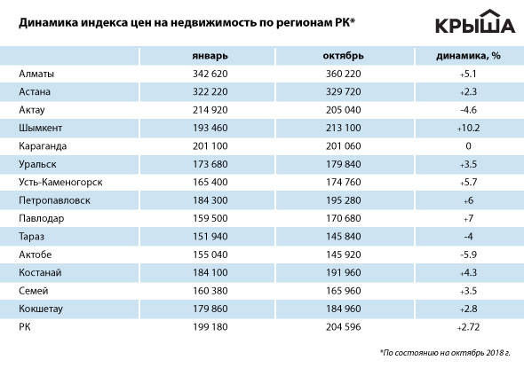 Самыми стабильными в октябре были рынки жилья Караганды (+0,3 процента), Семея (+0,2 процента) и Тараза (+0,1 процента).