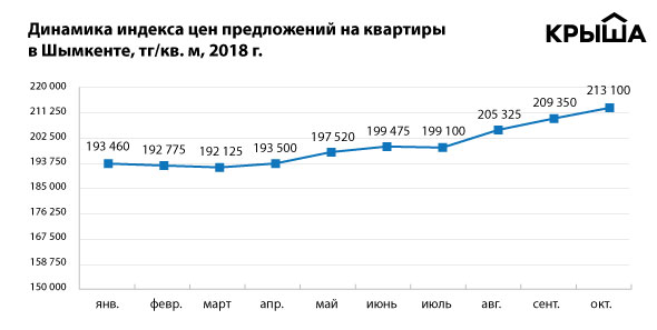 В Шымкенте прирост ограничился 1,8 процента. Единица площади оценивается продавцами в среднем в 213,1 тысячи тенге.