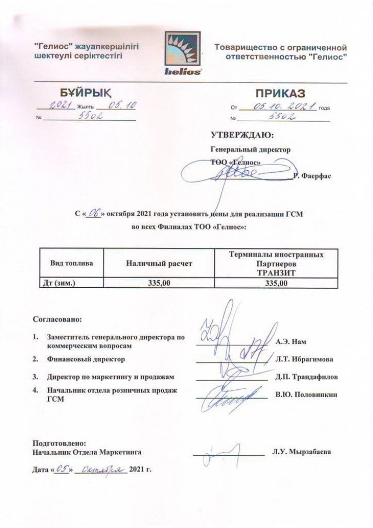 "С учетом стоимости закупа, затрат на транспортировку и минимальной рентабельности сформировалась стоимость зимнего дизельного топлива для реализации на АЗС на уровне 335 тенге за один литр", - сообщили в Helios.