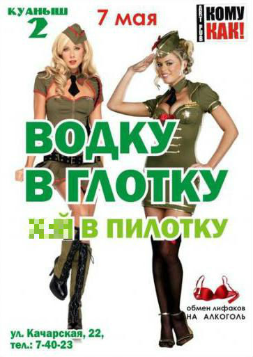 Жителей города Рудный (Костанайская область) возмутил рекламный постер, размещенный в социальных сетях сотрудниками местного кафе "Куаныш-2". Объявление о вечеринке, приуроченной к государственному празднику 7 мая, венчает недвусмысленный слоган, пишет газета "Наш Костанай".
