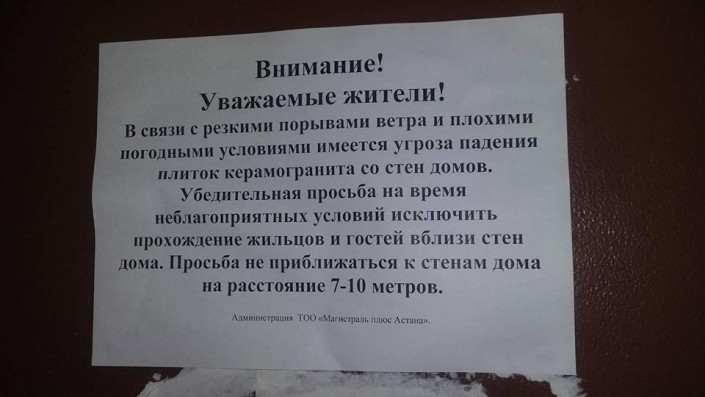 Отметим, в октябре 2015 года в Астане упавшая со стены высотного дома плитка воткнулась в капот автомобиля. По данным очевидцев, плитка упала с высоты девятого этажа дома, расположенного по адресу: улица Сауран, 9 А. Тогда автор снимка отмечал, что этот дом был построен по государственной программе.