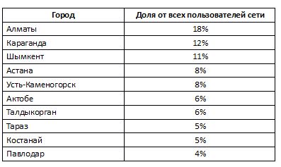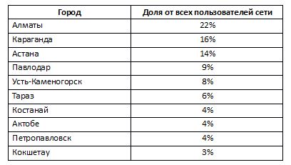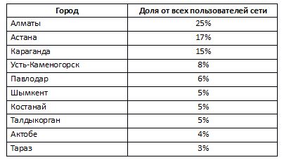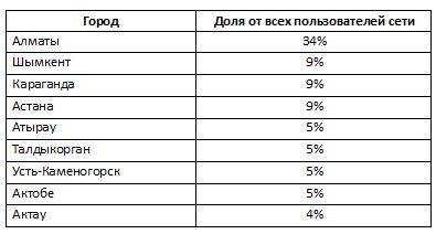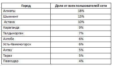 Если говорить о возрастных характеристиках, то значительная доля пользователей "Вконтакте" - молодежь 18-29 лет - 60 процентов, возрастная группа 30-40 лет - 28 процентов и 41-55 лет - 12 процентов. Больше всего этой соцсетью среди городского населения пользуются алматинцы - 18 процентов.