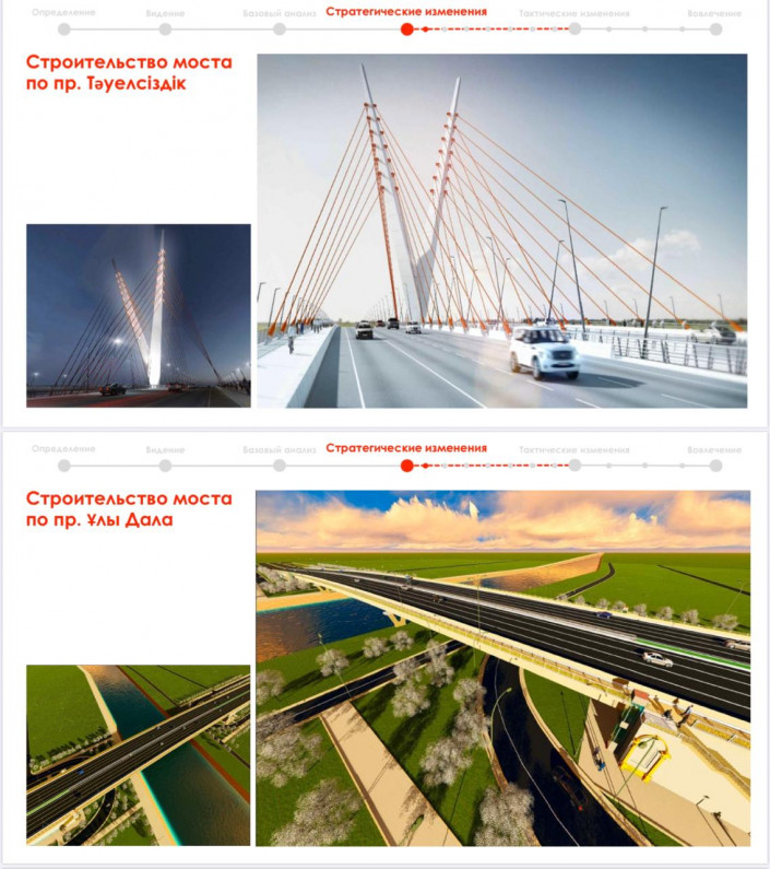 "К примеру, барьером между разными центрами притяжения является отсутствие мостов над рекой. Планируем увеличить количество связующих мостов: это по проспекту Тауелсиздик, Улы дала, также нужны развязки на пересечении шоссе Коргалжын, проспекта Кабанбай батыра и проспекта Туран. Акцент сделан на создании комфортной пешеходной среды. К примеру, на улице Бейбитшилик расширим и благоустроим пешеходные зоны, откроем уютные мини-кафе, будет больше зеленых насаждений. Район Евразии тоже охватим на первом этапе. По такому принципу преобразим и другие улицы, установим арт-объекты", - сказал Асхат Садуов.