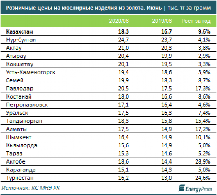 В июне средняя цена ювелирных изделий из золота в крупных городах и мегаполисах страны составила в среднем 18,3 тысячи тенге за один грамм, это на 9,5 процента больше, чем годом ранее.