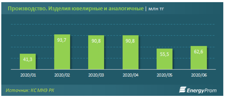 В июне производство ювелирных и прочих аналогичных изделий составило всего 62,6 миллиона тенге. В "карантинном" мае показатель был еще ниже: лишь 55,5 миллиона тенге. Реальный рост производства к июню прошлого года - 3,3 процента.