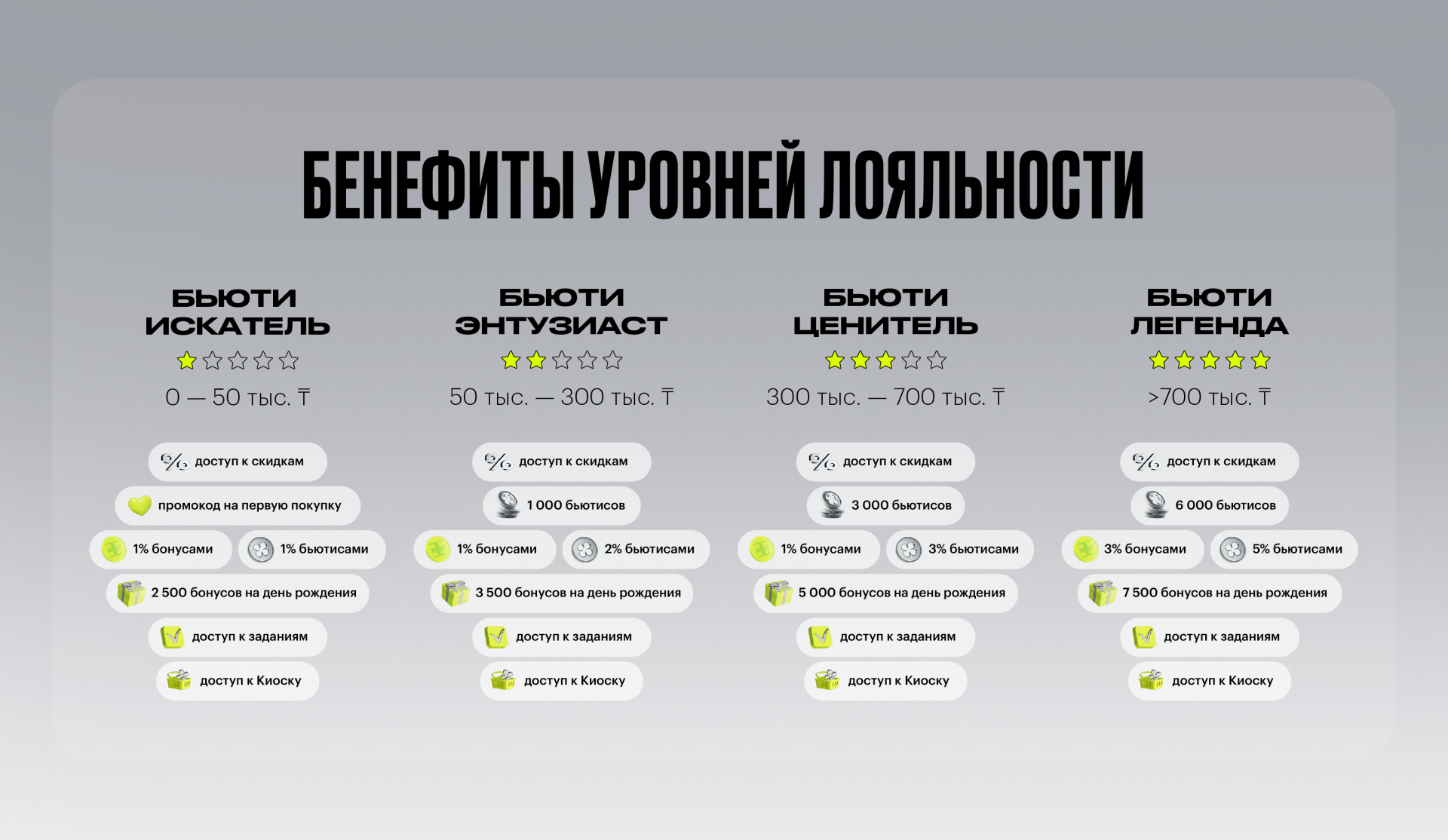 - "Бьюти-легенда" — высший уровень, присваивается при достижении порога покупок в 700 000 тенге. "Бьюти-легенды" за покупки будут получать 3 процента бонусами и 5 процентов бьютисами.