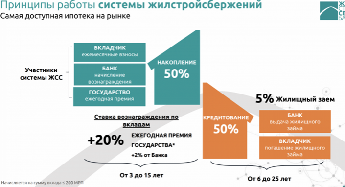Как известно, основной продукт ЖССБ - это жилищный заем, при котором вкладчик накапливает 50 процентов от стоимости жилья, сроком не менее трех лет. Оставшиеся 50 процентов он получает в кредит по ставке от 3,5 до 5 процентов годовых. При этом, чтобы вкладчик смог быстрее накопить, ему в этом деле помогает государство, ежегодно начисляя премию государства в размере 20 процентов (на сумму, не превышающую 200 МРП).