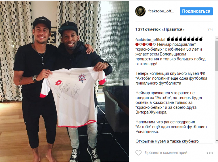 "Теперь коллекцию клубного музея ФК "Актобе" пополнит еще одна футболка гениального футболиста. Неймар признался, что ранее не следил за "Актобе", но теперь будет болеть в Казахстане только за "красно-белых" и за своего друга Витора Жуниора", - сообщает официальный Instagram "Актобе".