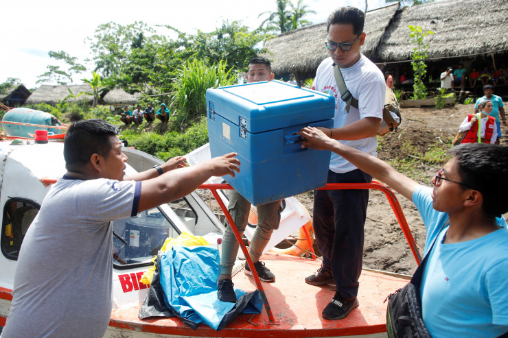 Государственные медицинские работники и члены Международного Красного Креста прибыли в деревню коренного народа урарина после трехдневной поездки, начинающейся с амазонского города Икитос - крупнейшего мегаполиса в мире, до которого невозможно добраться по сухопутным дорогам. На лодку они загрузили ящик-холодильник с 800 дозами китайской вакцины Sinopharm, охлажденными сухим льдом.