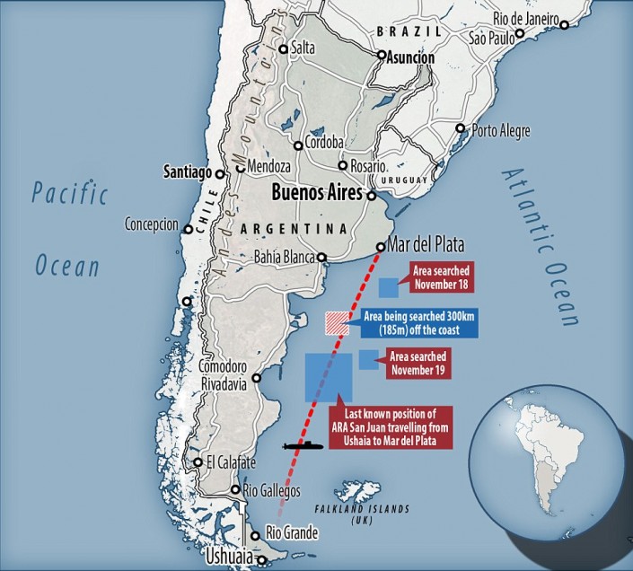 Дизель-электрическая подводная лодка ВМС Аргентины "Сан-Хуан" перестала выходить на связь 15 ноября. Субмарина совершала плановый маршрут из порта Ушуайя в город Мар-дель-Плата. В момент пропажи она находилась в 400 километрах от побережья Аргентины в Атлантическом океане.