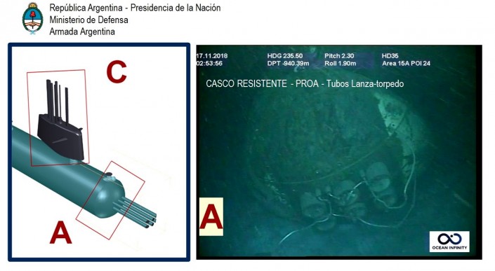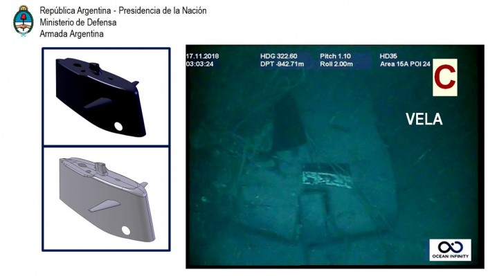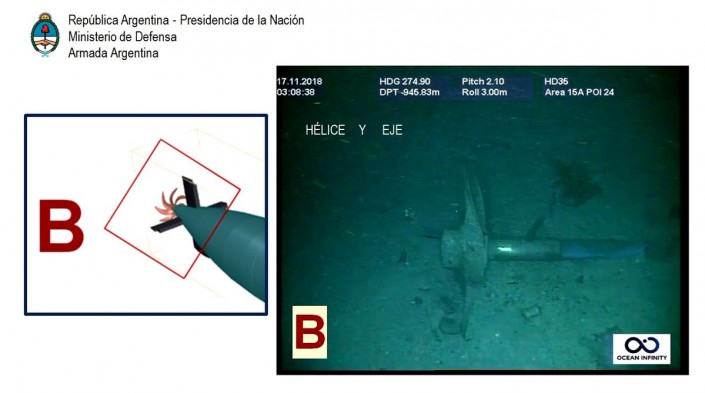 Между тем ВМС Аргентины опубликовали фото подводной лодки "Сан-Хуан". На кадрах показаны разрушенная часть корпуса и движущий винт. Также были идентифицированы другие части подводной лодки меньших размеров и форм, которые соответствуют носовой части и корме.