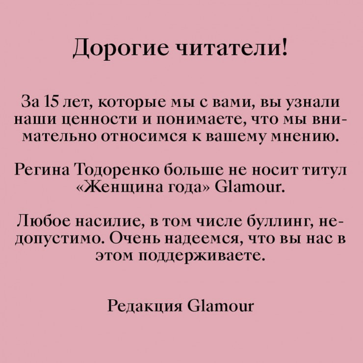 Она предположила, что, возможно, Тодоренко неправильно выразилась. Но издание не готово вернуть ей звание. "Наверняка какие-то формулировки у Регины были не совсем точные. Но если вы смотрели эфир, то имели возможность наблюдать, что ее позиция была довольно последовательной", - подчеркнула главный редактор журнала.