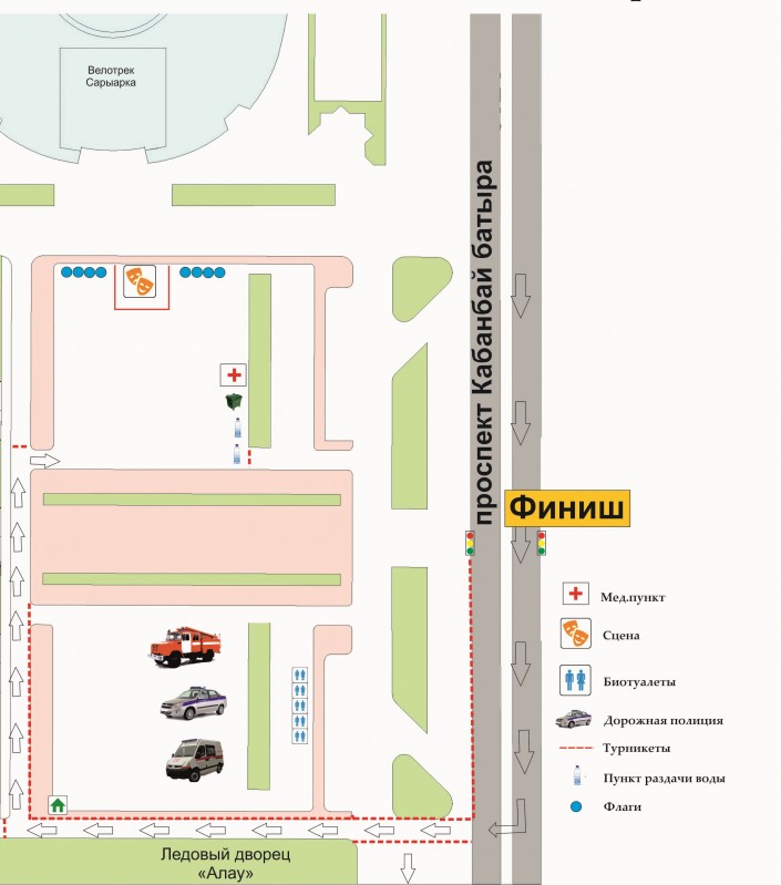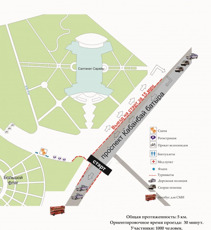 Стоит отметить, что в период проведения велопробега 18 августа с 07.45 до 08.45, будет частично ограничено движение автотранспорта по маршруту велопробега (по проспекту Кабанбай батыра). Просим автолюбителей заранее планировать свои маршруты с учетом перекрытия.