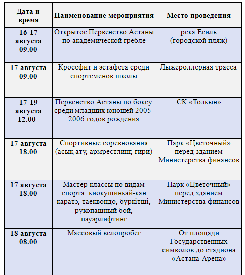 В эти дни все спортивные дворцы, комплексы и клубы города проведут соревнования и турниры, в которых примут участие около 3 000 спортсменов. Управление культуры и спорта Астаны приглашает не только профессионалов, но и всех любителей активного и здорового образа жизни, гостей и жителей столицы принять участие в запланированных мероприятиях.