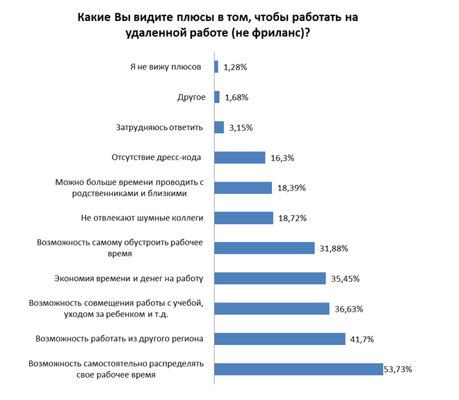 В своих вариантах ответов на вопрос "Какие вы видите плюсы в том, чтобы работать на удаленной работе (не фриланс)?" респонденты указали следующее: