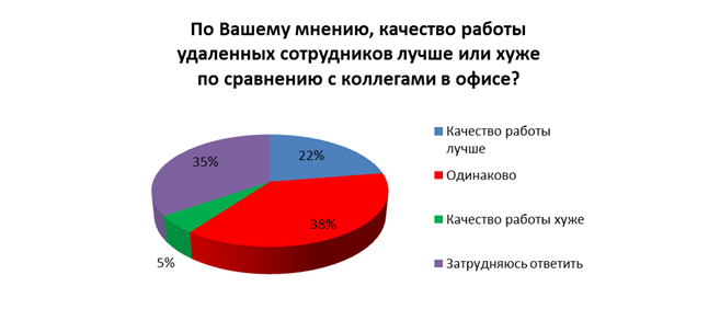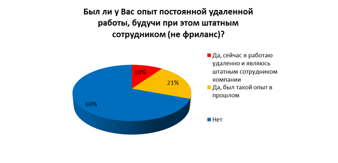 При этом выбирая размер заработной платы, 50 процентов респондентов выбрали работу в офисе за большие деньги. Участие в опросе приняли 8 276 соискателей. Удаленным сотрудником считается штатный работник, выполняющий работу вне местонахождения работодателя и отправляющий результаты труда по Интернету. С работником заключен договор о дистанционной работе, и на него распространяются нормы трудового законодательства (об отпуске и так далее).