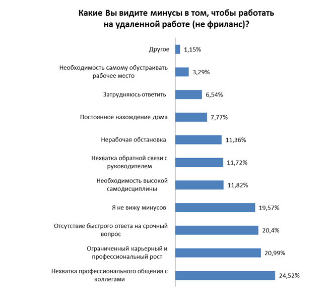 В своих вариантах ответов на вопрос "Какие вы видите минусы в том, чтобы работать на удаленной работе (не фриланс)?" респонденты указали следующее: