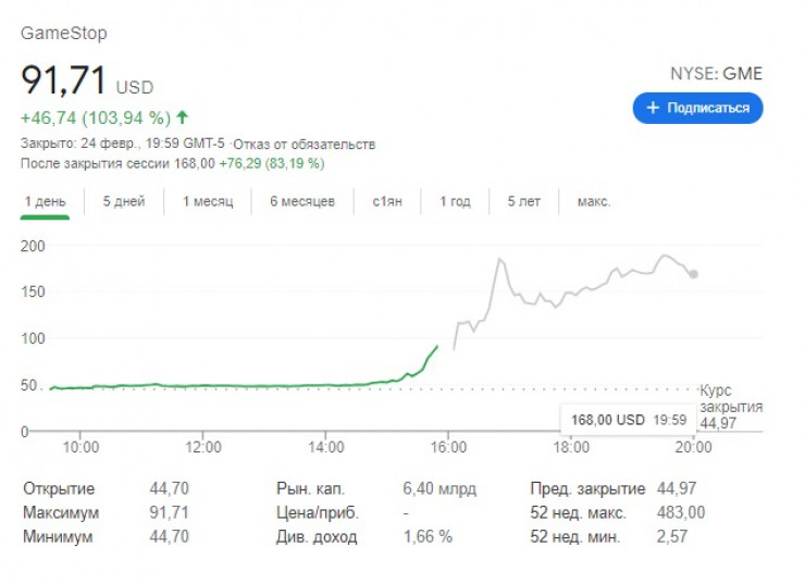 К моменту закрытия рынка 24 февраля стоимость акции составила 91,71 доллара, увеличившись на 103,9 процента по сравнению с предыдущим днем.