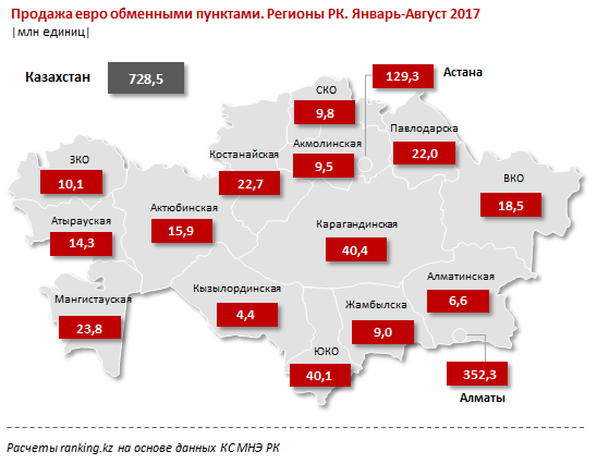 Около половины всех продаж евро за январь-август 2017 года были произведены обменными пунктами Алматы - 352,3 миллиона евро, доля от РК - 48,4 процента. На втором месте Астана - обменными пунктами столицы было продано 129,3 миллиона евро, доля от РК - 17,7 процента. Замыкает топ-3 Карагандинская область - 40,4 миллиона евро, доля от РК - 5,5 процента.