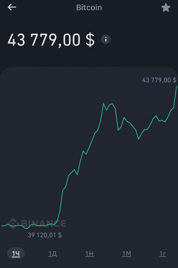 По данным портала CoinMarketCap, высчитывающего среднюю цену более чем по 20 биржам, по состоянию на 19.00 по времени Нур-Султана стоимость биткоина росла на 21,34 процента - до 43 309 долларов. На крупнейшей по объему торгов криптовалютами бирже Binance, по данным на 19.23 по времени Нур-Султана, биткоин дорожал на 10,71 процента - до 43 779 долларов - и продолжает расти.